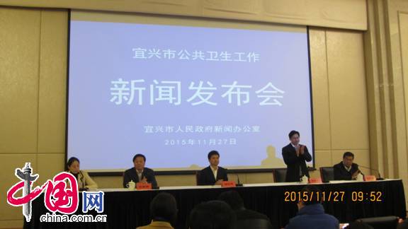 (中国网江南 2015年11月27日讯)由宜兴市人民政府新闻办公室举办的宜兴市公共卫生工作新闻发布会,在宜兴市政府会议中心第二会议室召开,会议由宜兴市人民政府新闻办公室主任许红霞主持,宜兴市人民政府副市长储红飙作宜兴市公共卫生工作通报、人民日报、新华日报、江苏人民广播电台、扬子晚报、现代快报、光明日报,无锡日报、无锡商报、江南晚报,无锡电视台、人民网、新华网、中国网、中国新闻网,中国江苏网,江苏人民广播电台、等几十家媒体参加了新闻发布会。