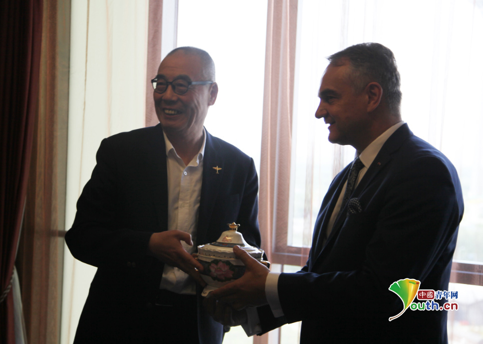 中国少数民族文物保护协会主席、CRDRI智库理事长杨华山向帕夫拉克先生赠送了瓷器大师索宗剑的作品。中国青年网记者 吴迪 摄