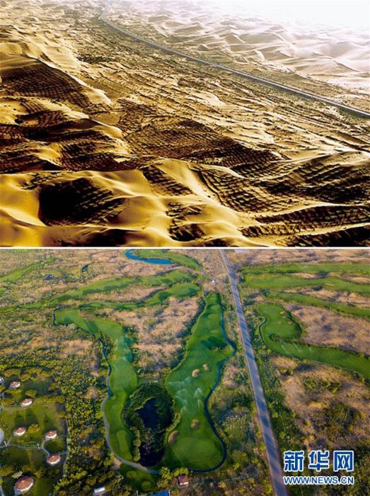 拼版照片:上图为20世纪末的内蒙古鄂尔多斯市杭锦旗库布其沙漠(资料照片);下图为库布其沙漠生态公园的景色(新华社记者彭源2018年7月11日无人机拍摄) 新华社发