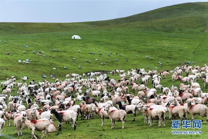 祁连山下牧场里的羊群(7月27日摄) 新华社记者 吴刚摄