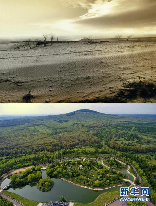 拼版照片:上图为治理前,山西省右玉县随处可见的荒凉沙地(资料照片);下图为生机盎然的山西省右玉县小南山森林公园(新华社记者曹阳2018年8月7日无人机拍摄) 新华社发