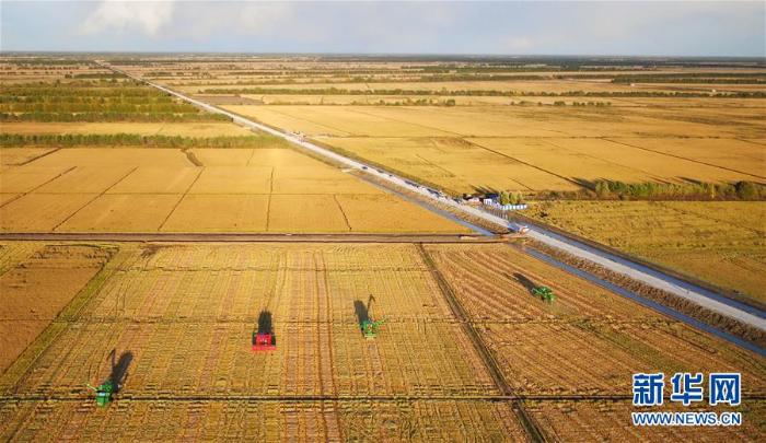 大型农机在黑龙江省三江平原一处稻田收割水稻(2017年9月28日无人机拍摄) 新华社记者 王建威摄