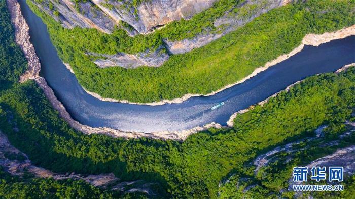 重庆巫山县小三峡的滴翠峡内,一艘游船满载着游客在美丽的山水间前行(2017年6月29日无人机拍摄) 新华社记者 刘潺摄