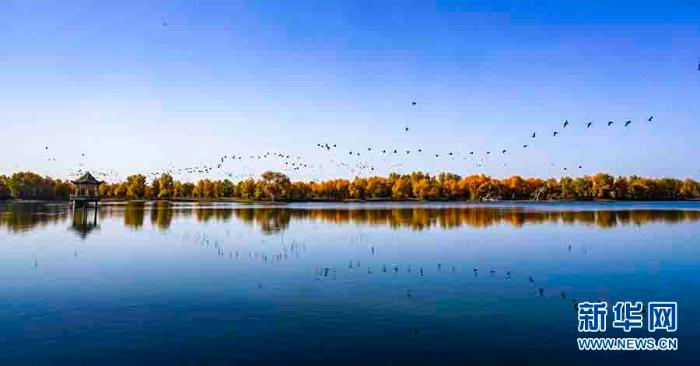 在位于新疆巴音郭楞蒙古自治州轮台县的一处胡杨林,一群鸟从水面上飞过(2018年10月25日摄) 新华社记者 赵戈摄