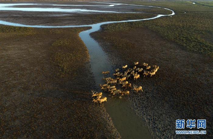 这是在江苏大丰麋鹿国家级自然保护区拍摄的麋鹿群(2018年10月4日无人机拍摄) 新华社发